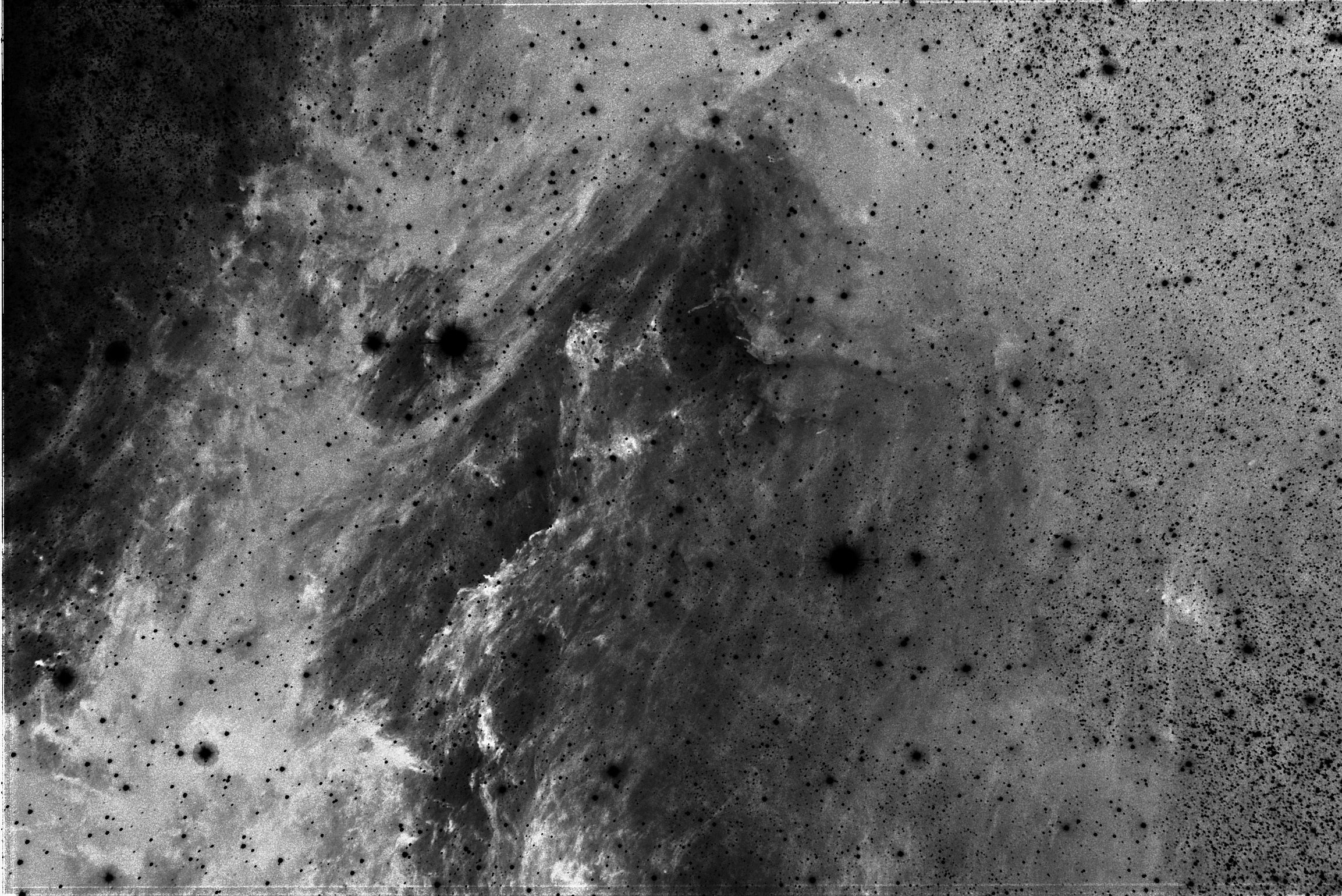 Im inversen Graustufenbild kommen etwas stärker die Strukturen in diesem Nebel zur Geltung. Unter anderem kann man rechts hinter dem „Auge des Pelikans“ deutlich 2 der angesprochenen Säulen mit den Herbig-Haro Objekten erkennen.