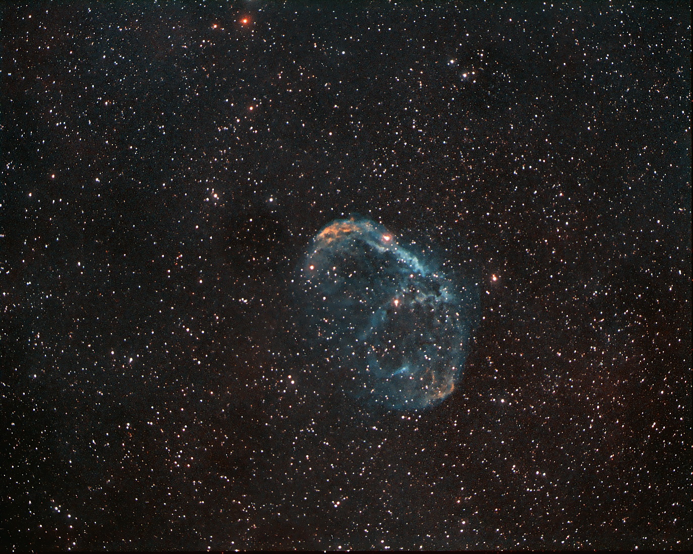 Dies ist eine Falschfarben-Aufnahme von NGC 6888, dem Sichelnebel. Er hat den Namen bekommen, weil man früher im sichtbaren Licht mit kleinen Teleskopen nur den helleren oberen Rand gesehen hat. Der Sichelnebel ist etwas ganz Besonderes und hat eine ausführlichen Betrachtung verdient, auch wenn dies nur eine kurze Beschreibung werden soll.