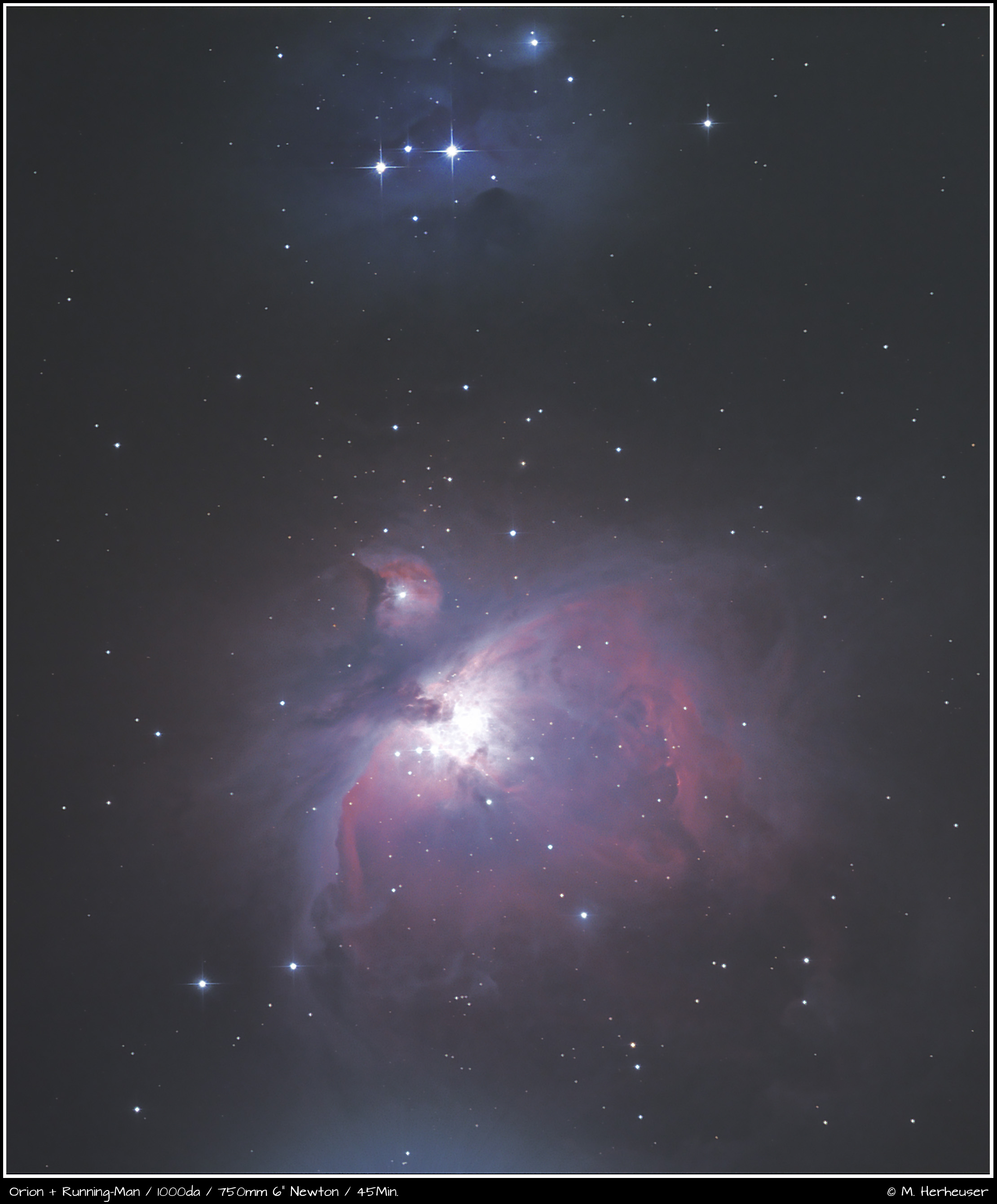 Das Zentrum des Orionnebels ist ein Sternentstehungsgebiet. Das Licht seiner Sterne benötigt etwa 1350 Jahre bis es uns erreicht. Damit liegt der Nebel direkt in unserer kosmischen Nachbarschaft. Der Orionnebel ist ein beliebtes Motiv für astrofotografische Anfänger. Es ist leicht aufzufinden, sehr hell und erfordert nur moderate Brennweiten. Die Kunst ist es, sowohl die feinen Nebelstrukturen als auch die Sterne im Zentrum darzustellen. Dabei besteht ein Konflikt, der vom Fotograf gelöst werden muss. Der Nebel gibt seine Struktur erst bei langer Belichtung Preis, die Sterne hingegen dürfen nur kurz belichtet sein, damit das Zentrum nicht ausbrennt. Das Optimum ist im gezeigten Bild also nicht erreicht, da das Zentrum bereits ausgebrannt ist.