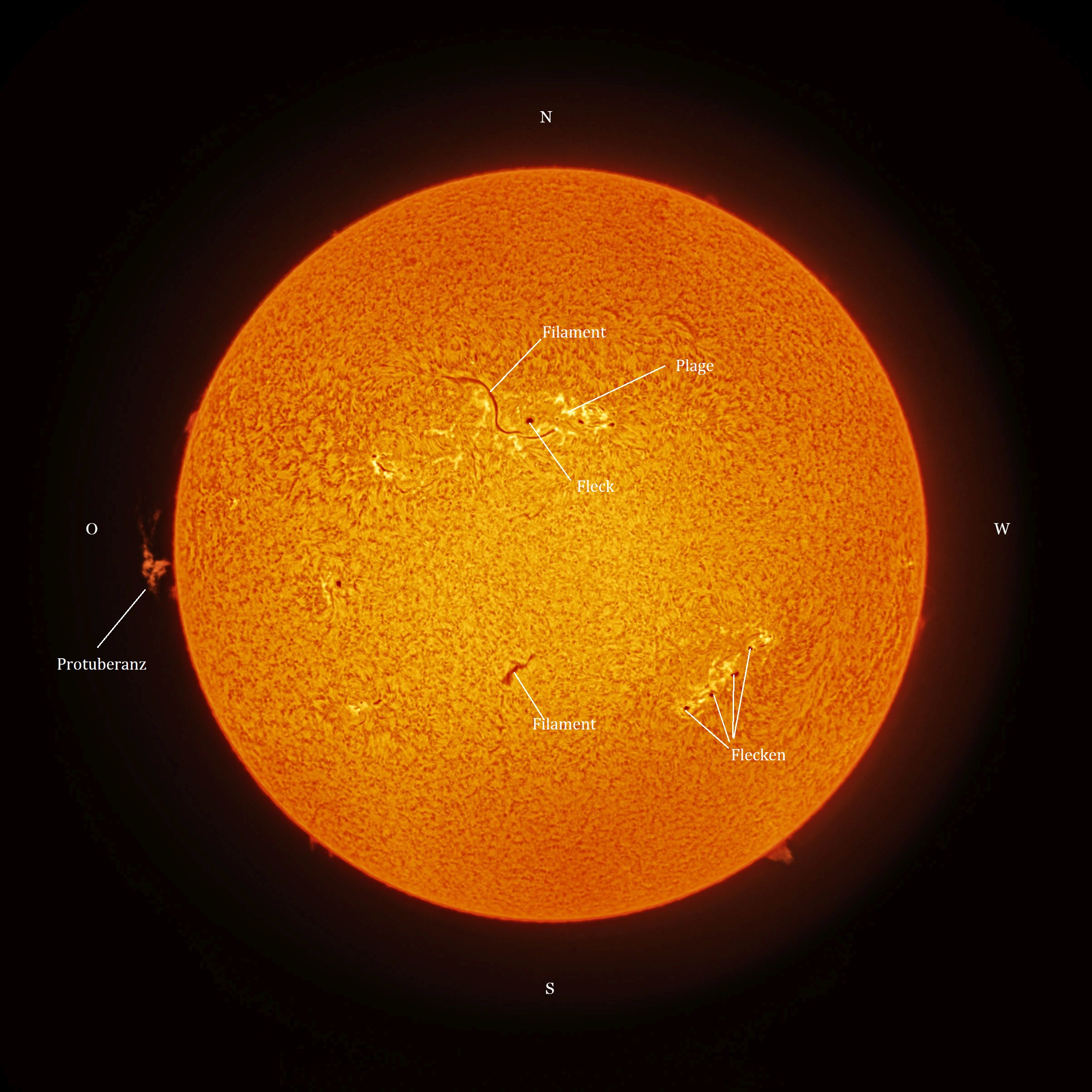 Das Bild des Monats Juli zeigt unsere Sonne. Unser Heimatstern spendet uns nicht nur Wärme und Licht, sondern ist auch ein interessantes Beobachtungsobjekt für Astronomen. Durch einen speziellen Filter können wir in die Chromosphäre des Sterns schauen. Diese Schicht liegt ca. 2000km über der eigentlichen Oberfläche der Sonne, der Photosphäre. Da die Photosphäre aber ungefähr eine Millionen mal heller strahlt, ist es ohne einen speziellen Filter nicht möglich die darüberliegende Schicht sichtbar zu machen. In der Chromosphäre lassen sich viele Erscheinungen beobachten. Neben den bekannten Sonnenflecken kann man auch sogenannte Flares, Filamente, Plages (Fackeln) und Protuberanzen beobachten. Filamente und Protuberanzen sind das gleiche Phänomen nur aus unterschiedlichen Blickwinkeln. Die Sonne schleudert Materie in das All. Bei einem Filament ist dabei die Richtung der Materie, auf den Beobachter zu.