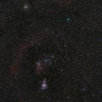 Unten rechts ist Rigel, ein Sternsystem mit 4 Sternen. Der Hauptstern ist ein blauer Riese im Übergang zum roten Überriesen. In der Mitte sind die drei Gürtelsterne mit dem Pferdekopfnebel unterhalb des ersten Sterns. Hier gerade noch zu erahnen. Darunter der große Orionnebel, der die Mitte des Schwertgehänges bildet. Hier nur angedeutet ist Barnards Loop, eine rot leuchtende Schleife aus ionisiertem Wasserstoff.