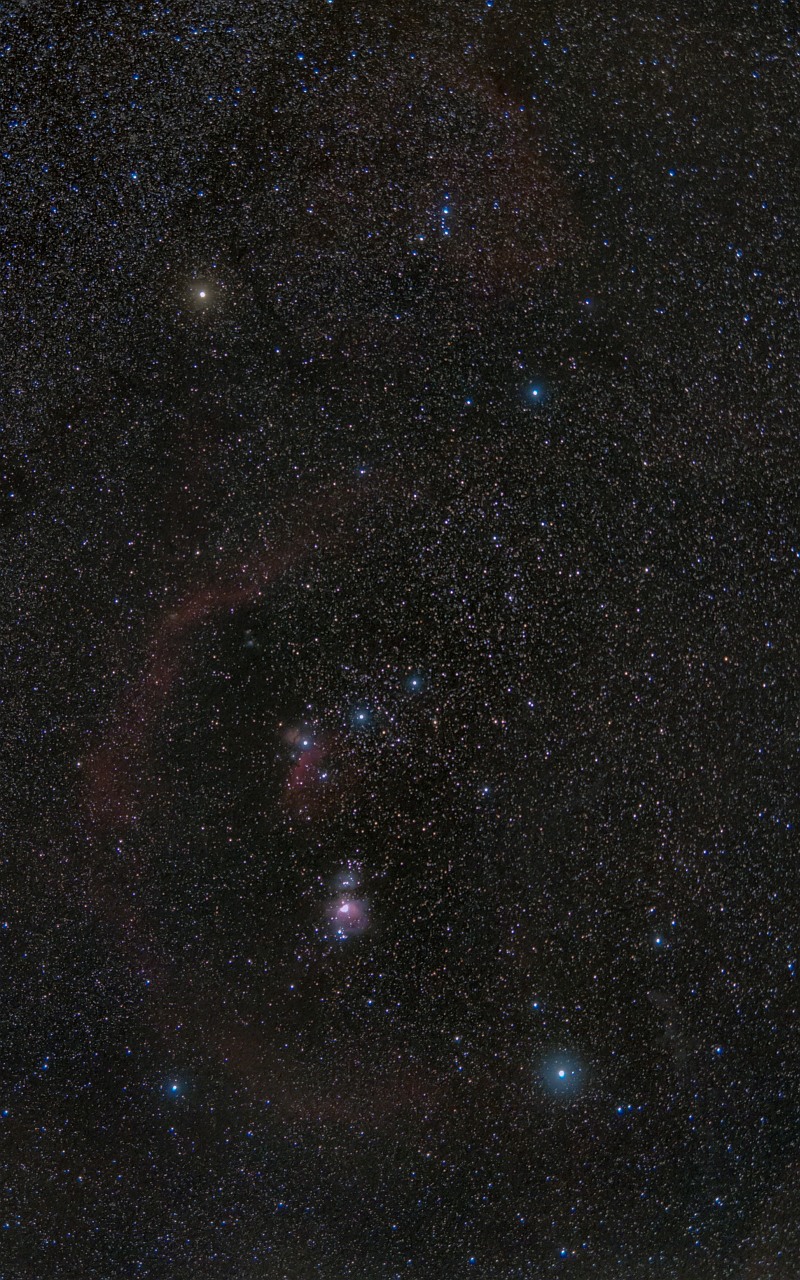 Unten rechts ist Rigel, ein Sternsystem mit 4 Sternen. Der Hauptstern ist ein blauer Riese im Übergang zum roten Überriesen. In der Mitte sind die drei Gürtelsterne mit dem Pferdekopfnebel unterhalb des ersten Sterns. Hier gerade noch zu erahnen. Darunter der große Orionnebel, der die Mitte des Schwertgehänges bildet. Hier nur angedeutet ist Barnards Loop, eine rot leuchtende Schleife aus ionisiertem Wasserstoff.