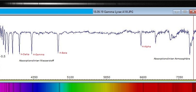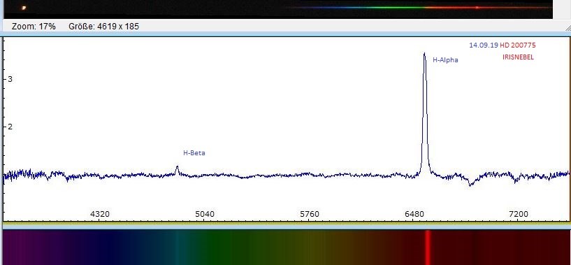 Die Spektroskopie zeigt die genauen Eigenschaften des Zentralsterns. Dabei wird die Strahlung/das Licht des Sterns(die einzig zugängliche Information für Menschen) durch ein Interferenzgitter(wie ein Prisma) aufgespalten und analysiert.Wir finden interessanterweise mindestens 2 Emissionslinien.Es sind die nach oben gerichteten Peaks im Bild.Dabei handelt es sich um eine Anregung des Gases einer eigenen Hülle (nicht der Wolke) des Sterns durch seine extreme Strahlung.Diese Hüllen befinden sich oft um junge Sterne scheibenförmig oder kugelförmig und lassen sich nur mit der Spektroskopie detektieren.Unser Stern hier bekommt dann eine Namenserweiterung auf B2Ve.Dabei ist B die Leuchtkraft/Temperatur/Masse-abhängige Klassenbezeichnung;2 die ebenfalls leuchtkraftabhängige Untergruppe;V die Größe (hier „Zwergstern“);und e die seltene Besonderheit des Sterns für „Emission“.Zum besseren Verständnis haben wir das Spektrum des kühleren Sternes Gamma Lyrae zum Vergleich beigefügt(Stern selbst passte nicht mehr aufs Foto).Er hat die Spektralklasse A1 III(III=Riesenstern).Hier sieht man nur abwärts gerichtete Absorptionslinien und keinerlei Emissionslinien.Über den Spektren sind die Aufnahmen des Sterns abgebildet wie sie aus dem Fotoapparat kommen.Sie müssen mit entsprechenden Programmen nachbearbeitet werden um die Grafik zu erstellen.