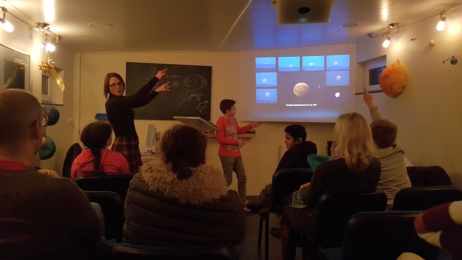 Am Mittwoch, den 14.11. durften wir eine Grundschulklasse der Freiherr-von-Schütz Gehörlosenschule aus Bad Camberg an unserer Sternwarte begrüßen. Insgesamt kamen neun Kinder in Begleitung von sechs Erwachsenen und verfolgten interessiert den Vortrag „Eine Reise durch unser Sonnensystem“ unseres jüngsten Mitglieds Leon Stauber. Das Besondere an dieser Veranstaltung war, dass unserem Vortragenden eine Dolmetscherin für Gebärdensprache zur Seite stand, die alles simultan übersetzt und somit dafür gesorgt hat, dass unsere kleinen Gäste, die im übrigen sehr wissbegierig und gut vorbereitet waren, nicht nur alles bestens verstanden haben, sondern auch Fragen gestellt und beantwortet werden konnten. Die eindrucksvollen Bilder und Animationen der Präsentation entlockten den Kindern so manch fasziniertes Staunen und es entstanden viele lebhafte Diskussionen.