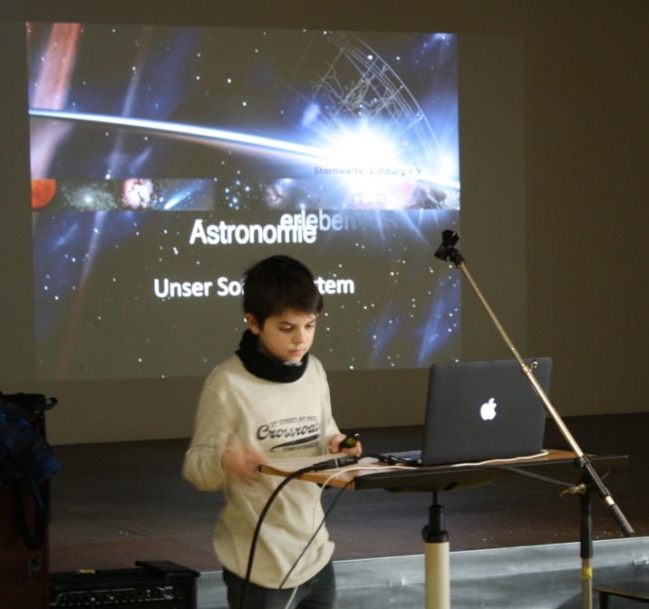 Unser jüngster Experte, Leon Stauber, 11, Jahre, hat zwei Realschul- und eine Hauptschulklasse mit auf eine Reise durch unser Sonnensystem genommen. Begleitet wurde Leon von unserem langjährigen Mitglied Berthold Fuchs dem wohl fachkundigsten Hobbyastronom der Sternwarte Limburg, als persönlicher „Backup“.