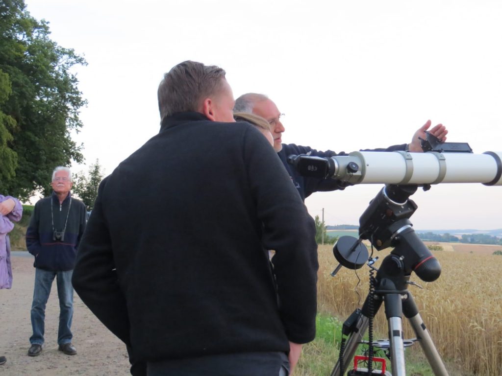 Eine halbe Stunde nach Verfinsterungsbeginn konnten wir die Mofi dann recht gut Verfolgen. Zwischendurch konnten unsere Besucher noch Albireo, Saturn, Ringnebel und sogar den Hantelnebel bestaunen. Bei einer Mofi geht halt auch etwas Deep Sky! Unser Sternbildexperte Berthold Fuchs erklärte, gekonnt wie immer, mittels Laser einige Sternbilder. Pünktlich zu vorhergesagten Zeit zog die ISS ihre Bahn über den Himmel.