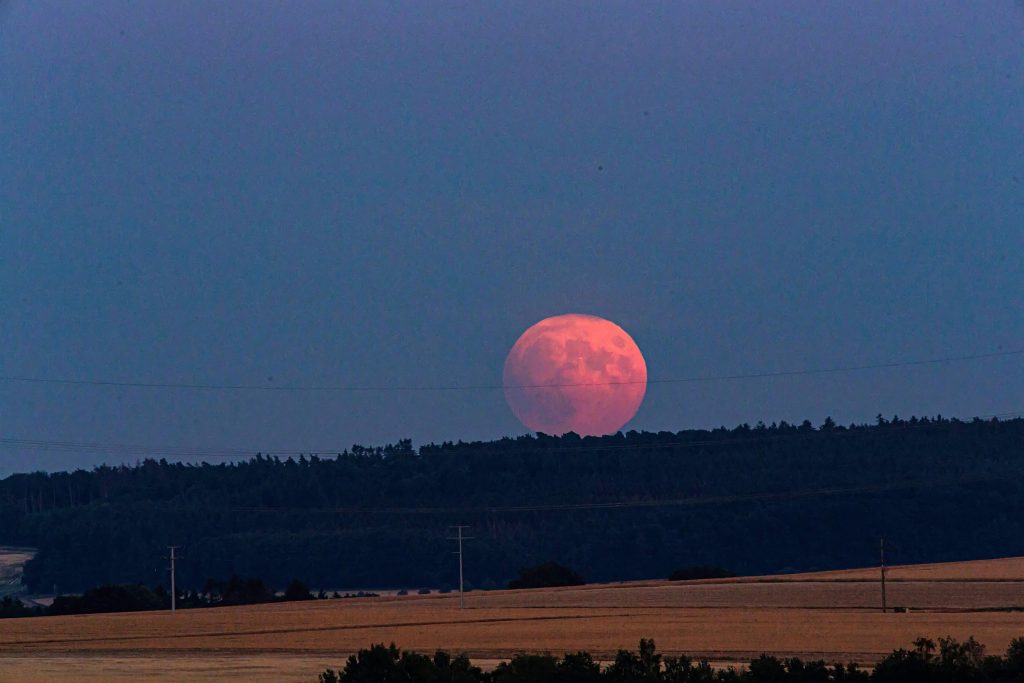 Richtung Osten zeigte sich Bewölkung, von der wir nicht abschätzen konnten, wie dicht sie war. Gegen 21:40 Uhr zeigte sich der vom Horizontdunst tiefrot gefärbte Mond über den entfernen Baumwipfeln am östlichen Horizont. Gerade wegen der Schleierbewölkung bot uns der Mond einen sehr schönen Anblick.