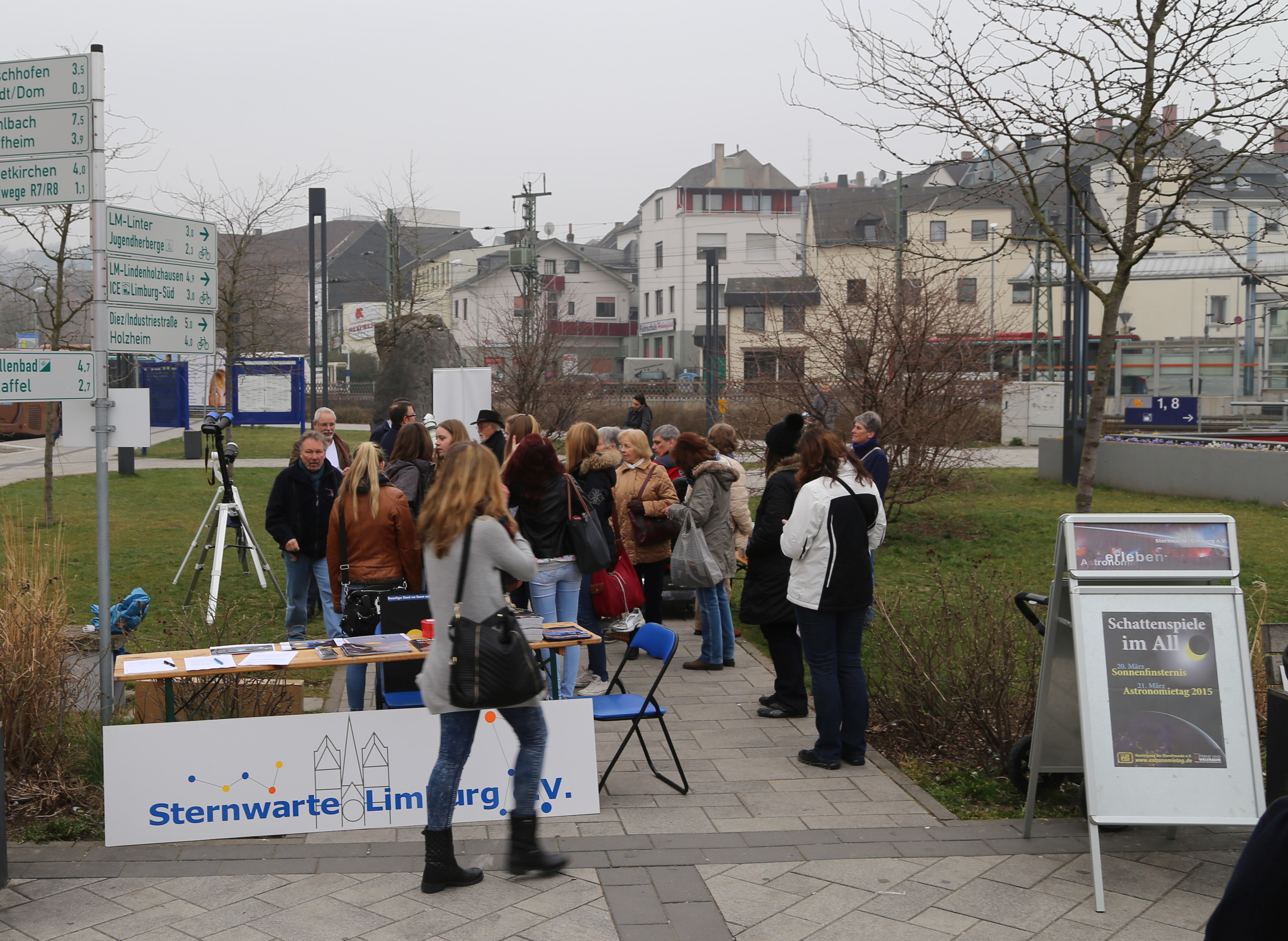Etwa eine Stunde vor dem ersten Kontakt begannen 7 Mitglieder der Sternwarte Limburg das Equipment auf dem Limburger Bahnhofsvorplatz aufzubauen. Schon mit dem Auspacken der ersten Stative und Teleskope erhielten wir eine erhöhte Aufmerksamkeit durch Passanten, die neugiereig schauten, was hier wohl passieren soll.