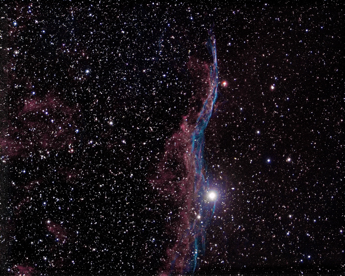 Dieses Foto von NGC 6960, auch Sturmvogel genannt, zeigt einen Teil des großen Cirrusnebels (auch Schleiernebel) im Sternbild Schwan, einem Emissions- und Reflektionsnebel. Schon dieses Gebiet ist mit mehr als 2 Monddurchmessern so groß, dass meine Kamera es nicht vollständig erfassen konnte.