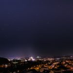 Das Bild des Monats April zeigt den Sternenhimmel über Limburg in Richtung Westen. Unterhalb des Greifenbergs, der sich in der unteren linken Ecke des Bilds befindet, bis hin zum Dom sieht man die Lahn, in deren Wasser sich die Lichter der Stadt spiegeln.