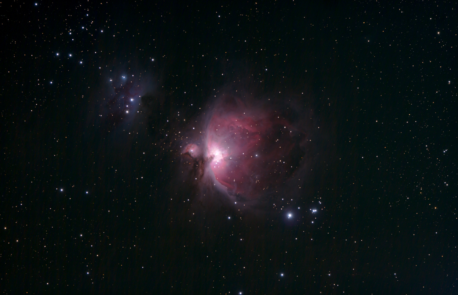Der Orionnebel ist ein Emissionsnebel im Sternbild Orion. Er ist ca. 1350 Lichtjahre von der Erde entfernt und hat einen Durchmesser von rund 30 Lichtjahren. Der Nebel besteht in erster Linie aus Wasserstoff. In diesen Wasserstoffwolken entstehen neue Sterne, die mit ihrer Strahlkraft den Nebel zum Leuchten bringen. Er ist sogar mit bloßem Auge sichtbar.