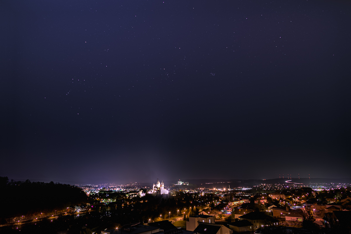 Das Bild des Monats April zeigt den Sternenhimmel über Limburg in Richtung Westen. Unterhalb des Greifenbergs, der sich in der unteren linken Ecke des Bilds befindet, bis hin zum Dom sieht man die Lahn, in deren Wasser sich die Lichter der Stadt spiegeln.