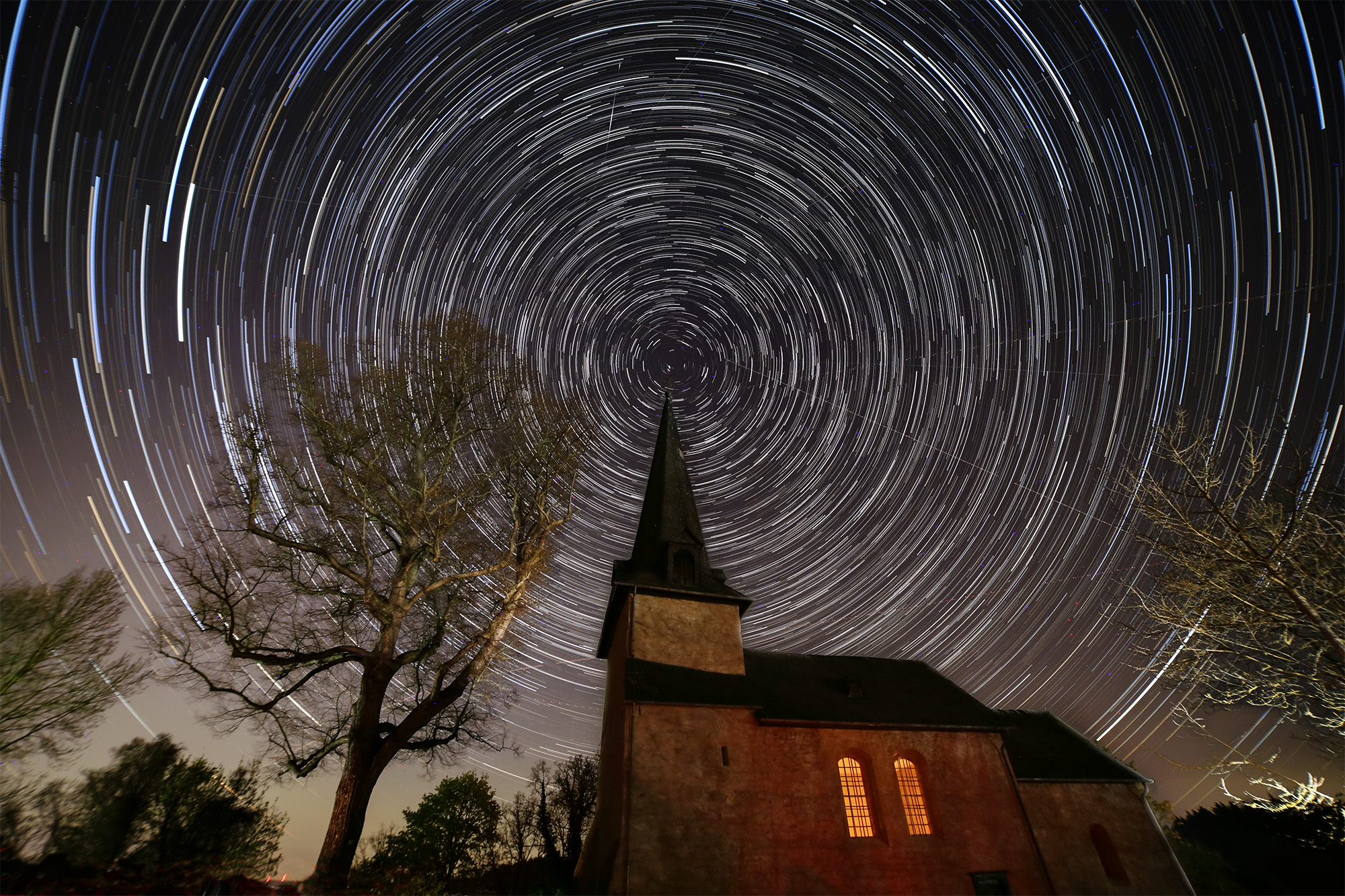Diese Strichspurenaufnahme entstand in der Nacht vom Karsamstag zum Ostersonntag zwischen 23 Uhr und 2 Uhr vor der Berger Kirche in Werschau.